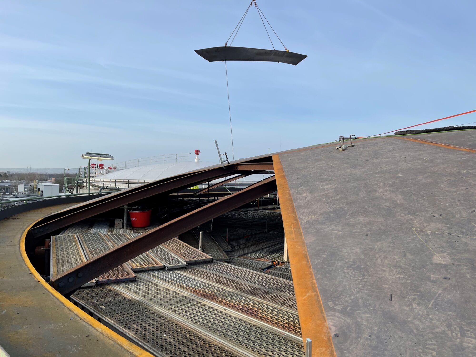 - In the next step, an installation opening was cut into the tank jacket, through which the 11-ton transport box containing the new membrane was inserted via a rail system, unfolded, and then reinstalled.