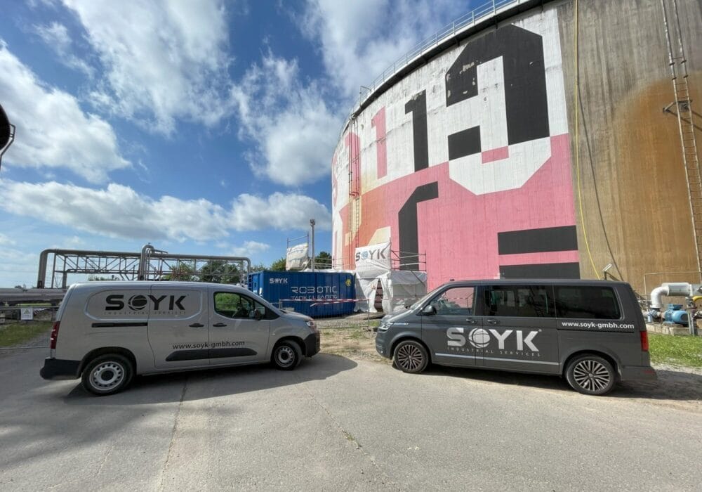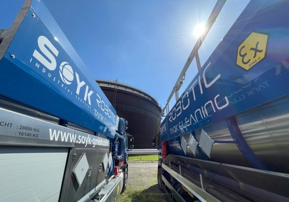 Die SOYK GmbH verfügt über spezielle Reinigungsroboter inklusive der zugehörigen Steuereinheit und Saugwagen. Dies bietet im Hinblick auf den Arbeitsschutz den entscheidenden Vorteil, dass im Zuge der Grobreinigung kein Personal in den Tank einsteigen muss (Befahrung). Über eine installierte Gerüstrampe wird der Reinigungsroboter in den jeweiligen Tank über ein ausreichend großes Mantelmannloch (NW 600) in den Tank eingebracht. Über den zugehörigen Steuercontainer wird der Roboter, auf dem mehrere Kameras montiert sind, im Tank mit Hilfe eines Joy-Sticks manövriert. Das Bedienpersonal beobachtet und steuert den Roboter über einen Bildschirm im Steuercontainer. Der Roboter ist über eine Saugleitung mit einem Saugwagen oder unserer ATEX-Schneckenpumpe verbunden, der das ausgebrachte Produkt dann der jeweils vorgesehenen Entsorgung zuführt.